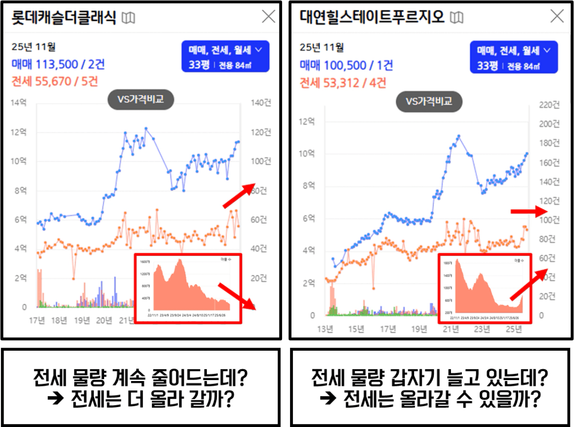 즉, 전세 물량 감소 → 전세가 상승 → (뒤이어) 매매가 상승