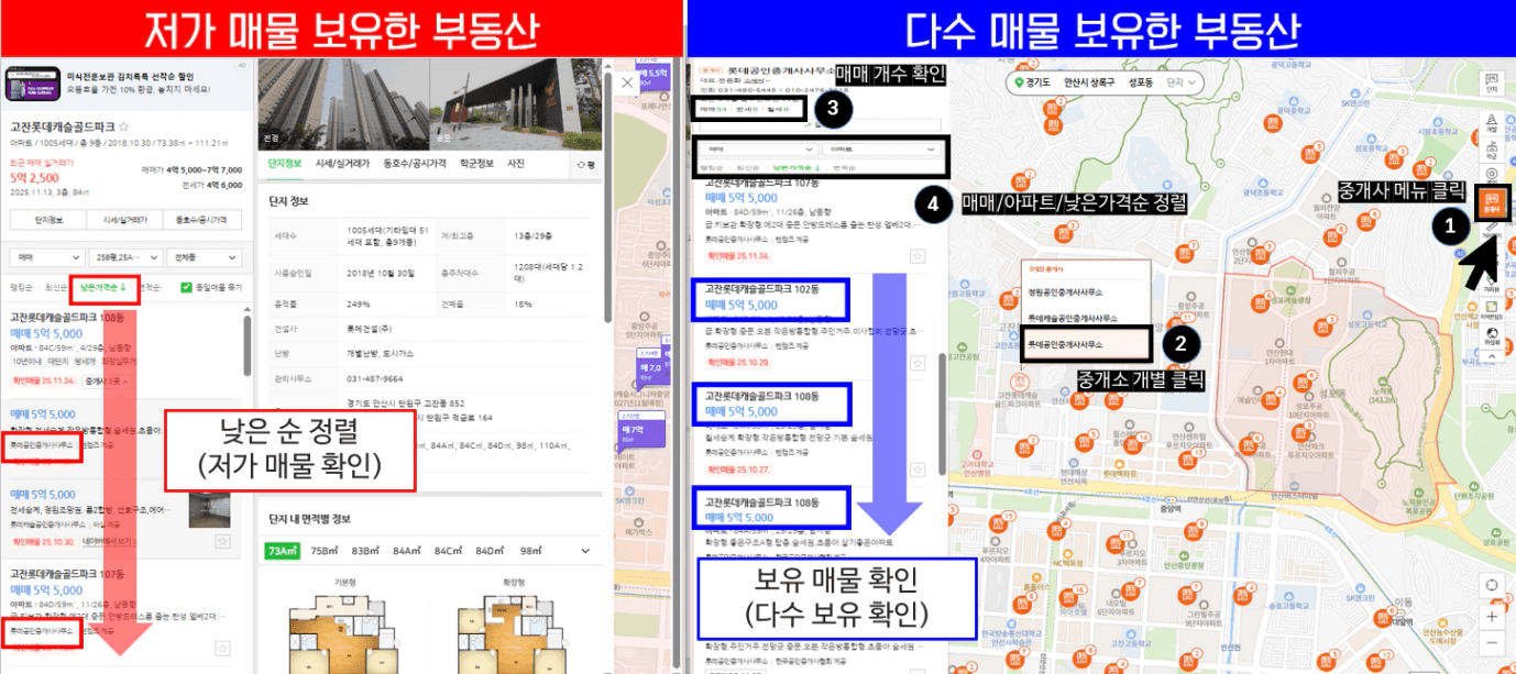 왼쪽 창에는 매물 리스트(낮은 가격순 정렬) → 저가 매물이 갖고 계신 부동산 확인