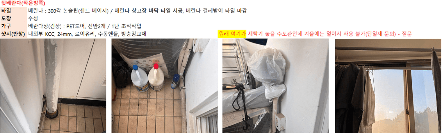 그래서 세입자분께서 가능하신 시간에 잠시 제가 혼자 가서 집 구조 사진과 인테리어 진행해야 할 부분을 모두 사진으로 찍어서 자료를 만들었습니다.(어찌저찌 대응을 했던 부분) 그리고 그 자료로 인테리어 업체 실측 전 1차 상담을 받았습니다.