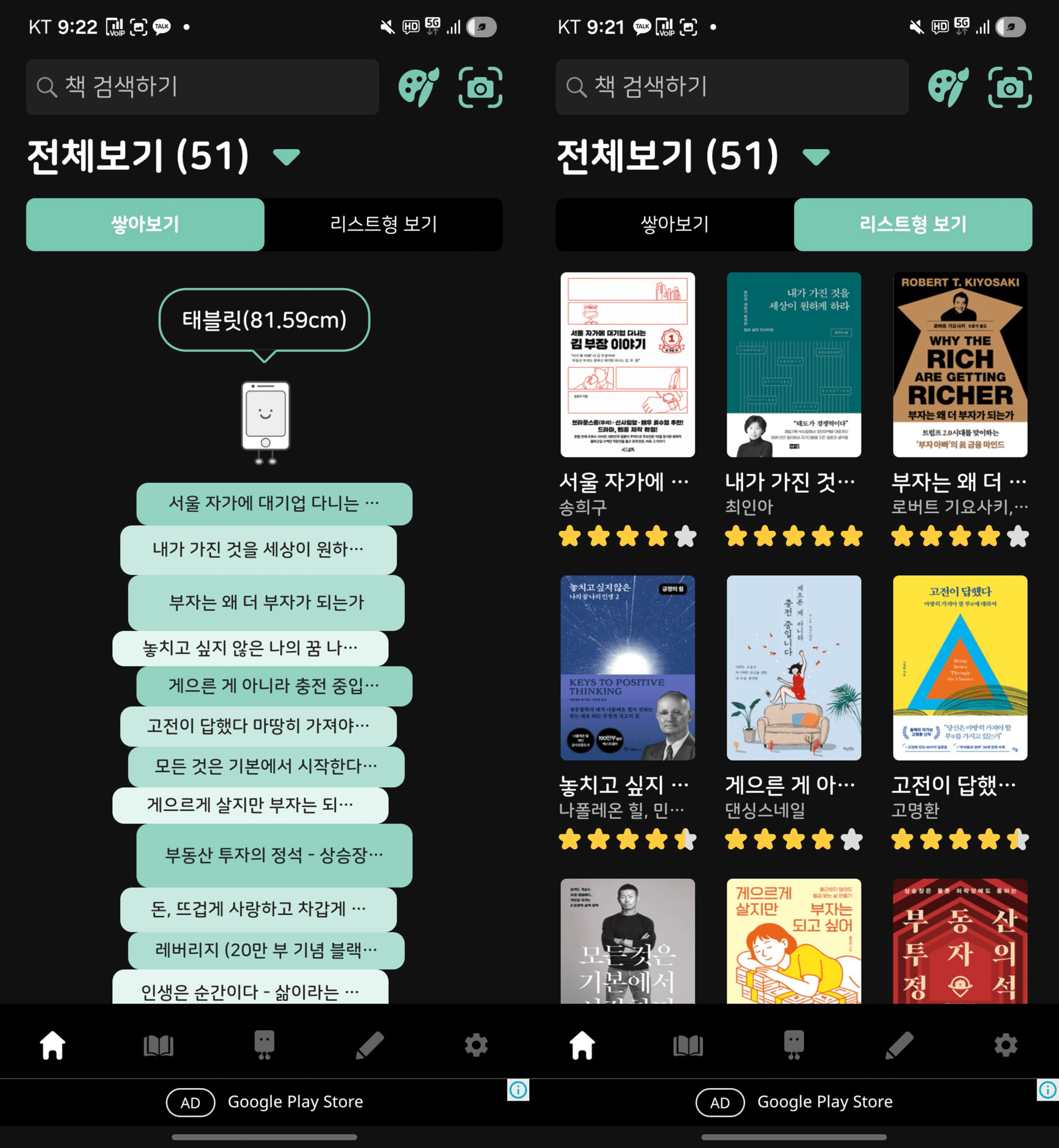 왼쪽처럼 쌓는 형태를 통해 내가 읽은 책들을 쌓으면 몇 cm되는지 볼 수 있는 점도 재미있는 요소였고