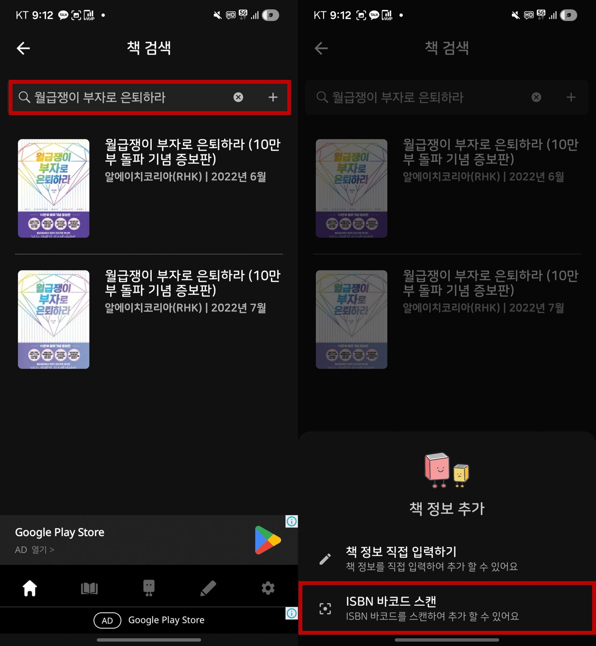 제가 자주 사용하는 방법은 오른쪽처럼 책의 바코드를 스캔하는 방법입니다