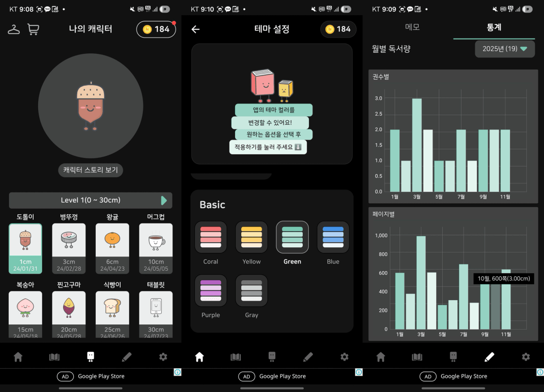 나만의 테마를 통해서도 어플을 예쁘게 꾸밀 수 있어 독서에 대한 애정을 더 키울 수 있어 좋았습니다