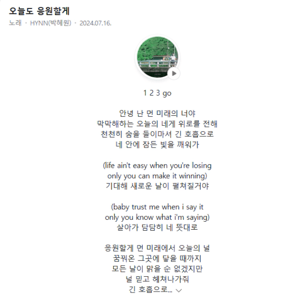 그리고 마지막으로 박혜원님의 “오늘도 응원할게” 라는 노래를 통해 저희가 얼마나 투자자로 제 자신을 믿고