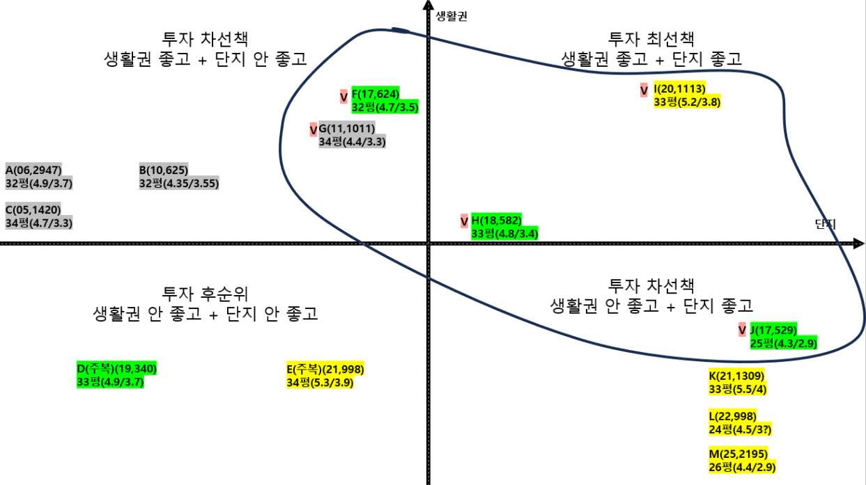 이런 식으로 투자금으로 들어오는 단지를 분류하고, 그 안에서 좋은 것 부터 차례로 매물 임장을 가기 시작합니다.