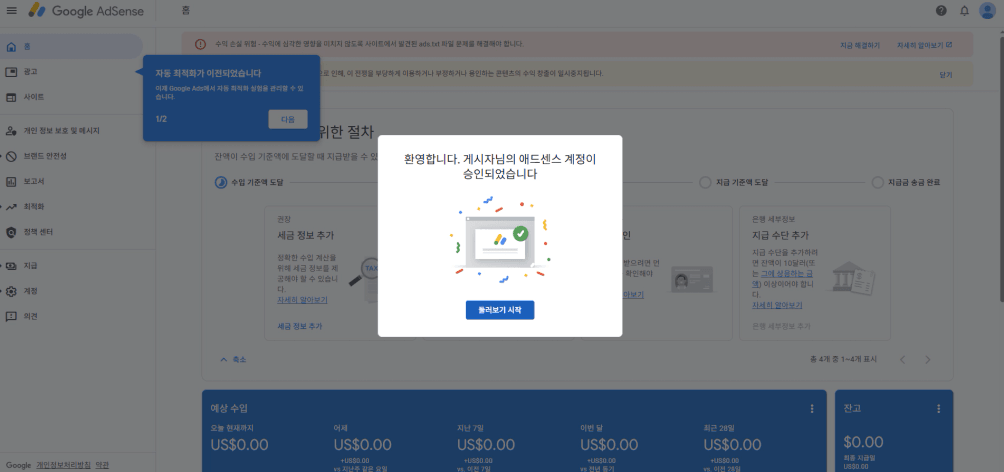 [도로명 주소 → 지번 주소 → 계정 삭제 후 기존 구글 계정] 으로 재도전… 이 과정을 거쳐서야 겨우 승인을 받게 됐습니다. 그래서 개인적으로 대부분 기존에 사용중이던 구글 계정이 있으실 것 같은데.. 그 계정으로 애드센스 가입하고 승인 받으시는걸 추천드립니다 ㅎㅎ.. 솔직히 오늘도 “아.. 안 됐겠지…” 하고 들어갔는데 ㅋㅋ 띠용? 승인!? 승인됐다는 걸 보는 순간 진짜 기분 최고였습니다.