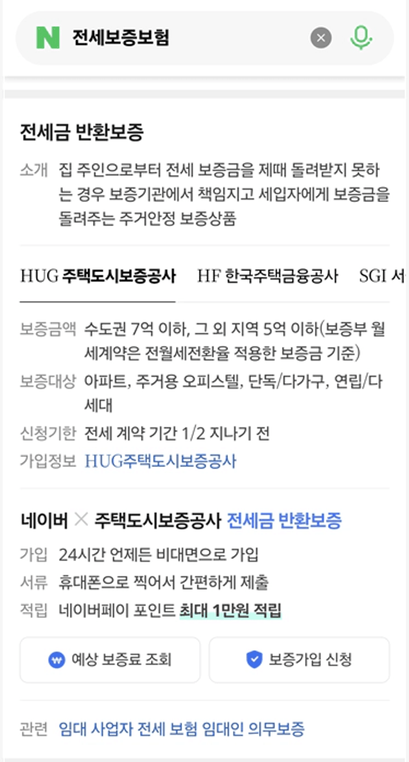 원래 핸드폰 네이버 검색창에서 전세보증보험이라고 검색을 하면