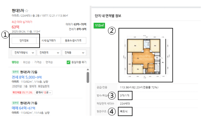 • ③ 방수/욕실수 : 방의 개수와 화장실 개수를 구분할 수 있음