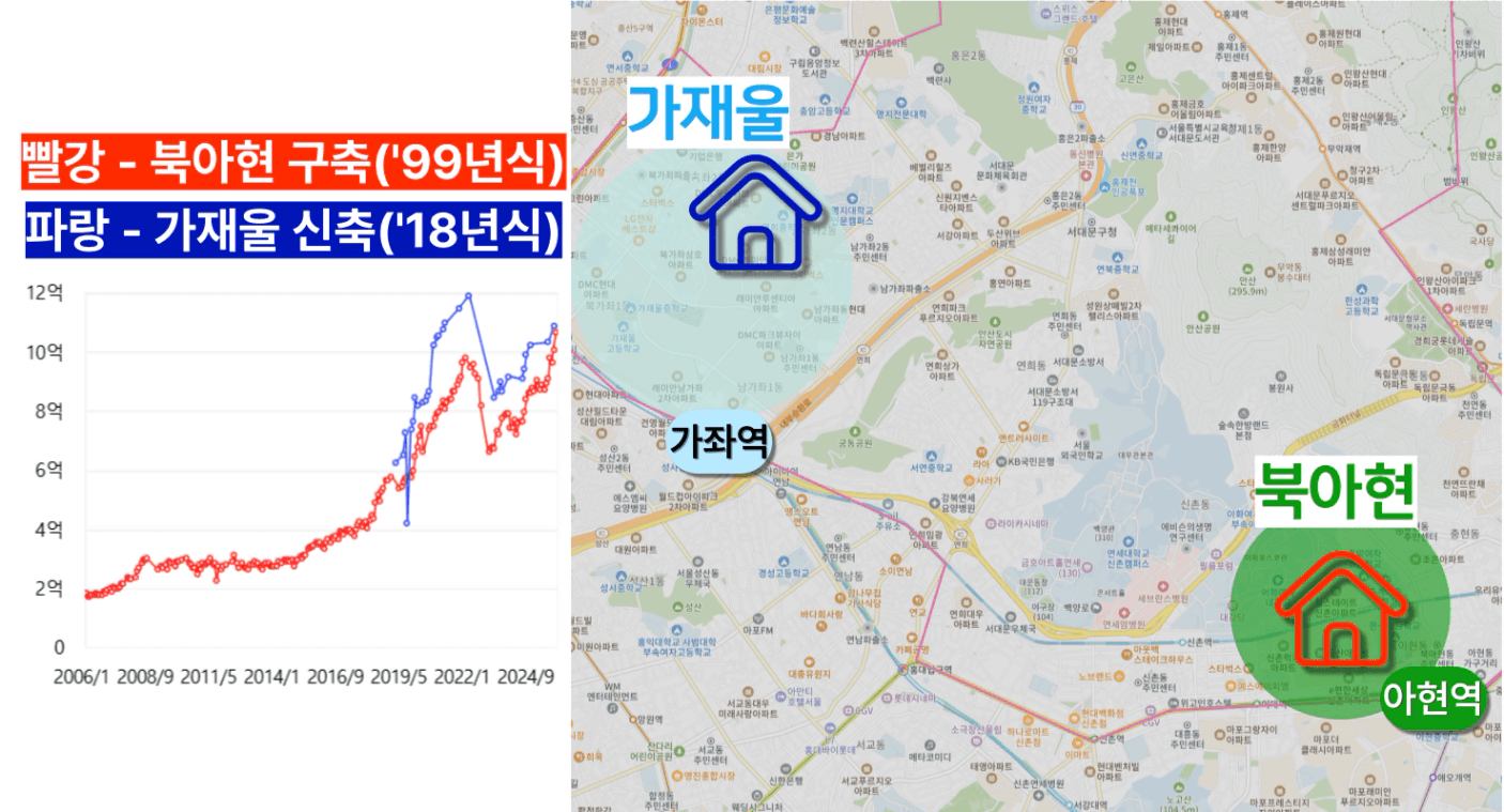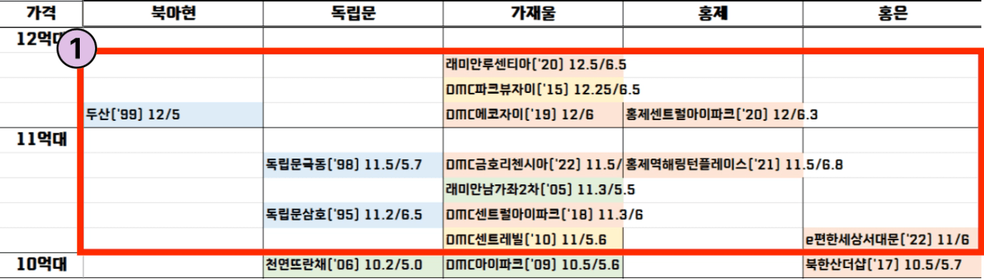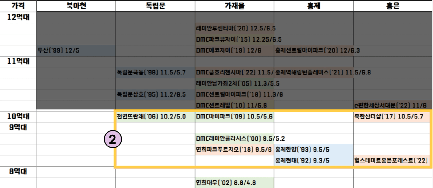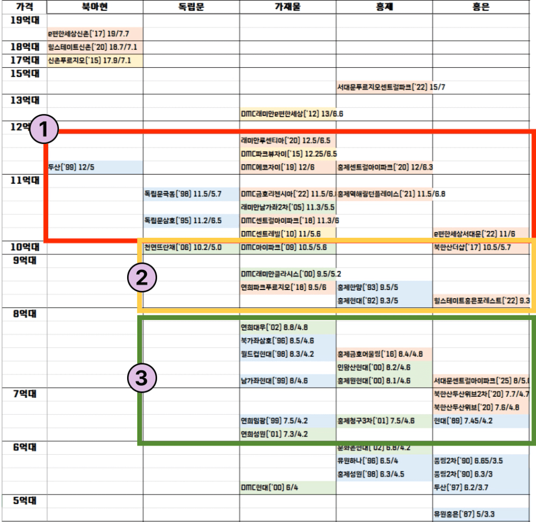 • 11~12억대 : 북아현/독립문 구축, 가재울/홍제 신축. 위치가 좋으면서 실거래가 수준으로