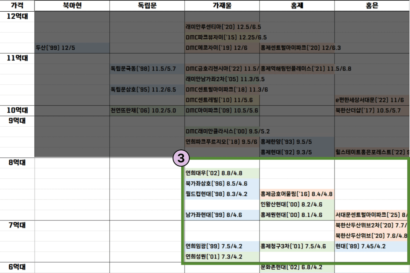 • 7~8억대 : 가재울/홍제 구축, 홍제/홍은 신축. 교통 좋으면서 택지