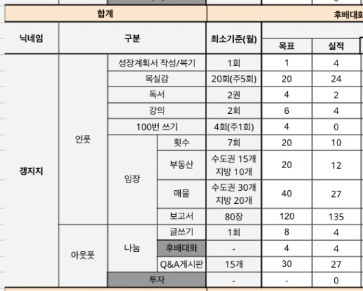 • 임장 : 강의준비로 입장을 많이 못갔지만 최소한의 시간으로 최대 효율을 내기위해서 많이 노력했습니다. 실제로 분임 가기전, 매임가기전 명확한 목표를 가지고 슬랙에 공유했고 실제로 매임중에도 그 목표를 잊지않기위해서 계속 상기해나가면서 사장님과 대화를 이뤄나갔습니다. 그리고 그게 임보까지 이어져서 결국에 성장과 인풋은 하나로 연결된다를 경험했던 성장이었습니다.