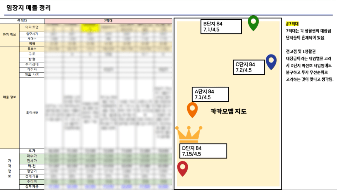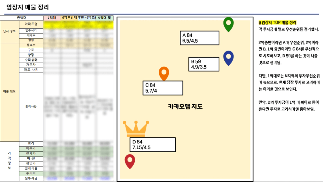 이후엔 각 금액대별로 구간을 나눠서 한 장표에 한 금액대씩 혹은 몇 개의 금액대씩 올려서 입지를 비교해보고 어떤 것이 가장 좋은 선택일지 적어봅니다. (꼭 1개의 매물일 필요는 없습니다. 2개가 나와도 됩니다.)
