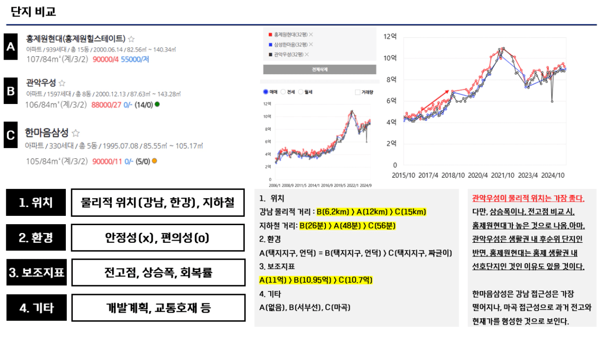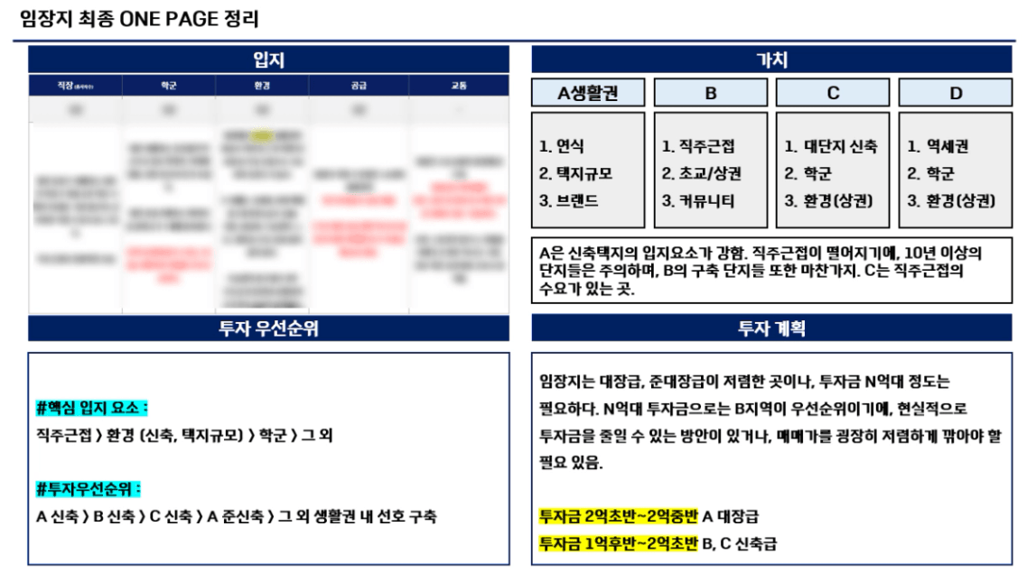 1. 입지가치를 정리해보고, 2. 생활권 별 가치를 정리합니다. 3. 그래서 투자우선순위는 무엇이며, 4. 지금 투자를 할 수 없더라도 나중에 어떤 식으로 투자 계획을 할지 나오면 됩니다.