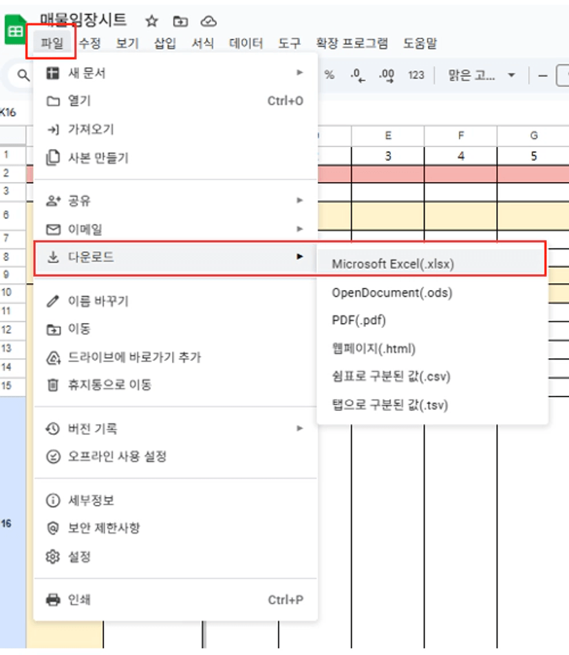 이후엔 구글시트에서 파일→다운로드→.xlsx를 클릭해 엑셀파일로 따로 저장합니다.
