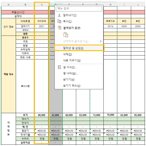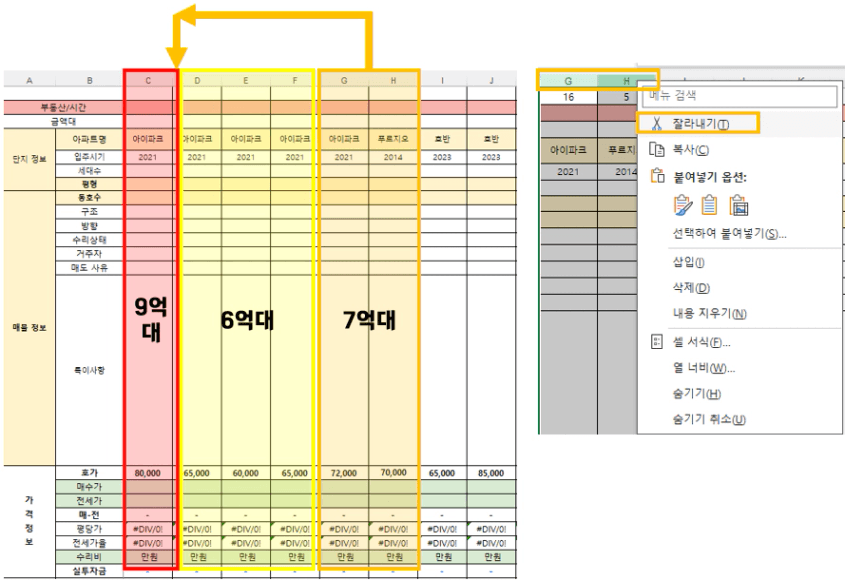 이후에 8억대인 C열 바로 뒤 D열을 우클릭 후 잘라낸 셀 삽입을 누르면, 7억대인 G, H가 쏙 하고 C와 D열 사이에 들어가게 됩니다. 엄청 간단하죠? 이런 식으로 금액대별로 나래비를 쭈욱 시킵니다.