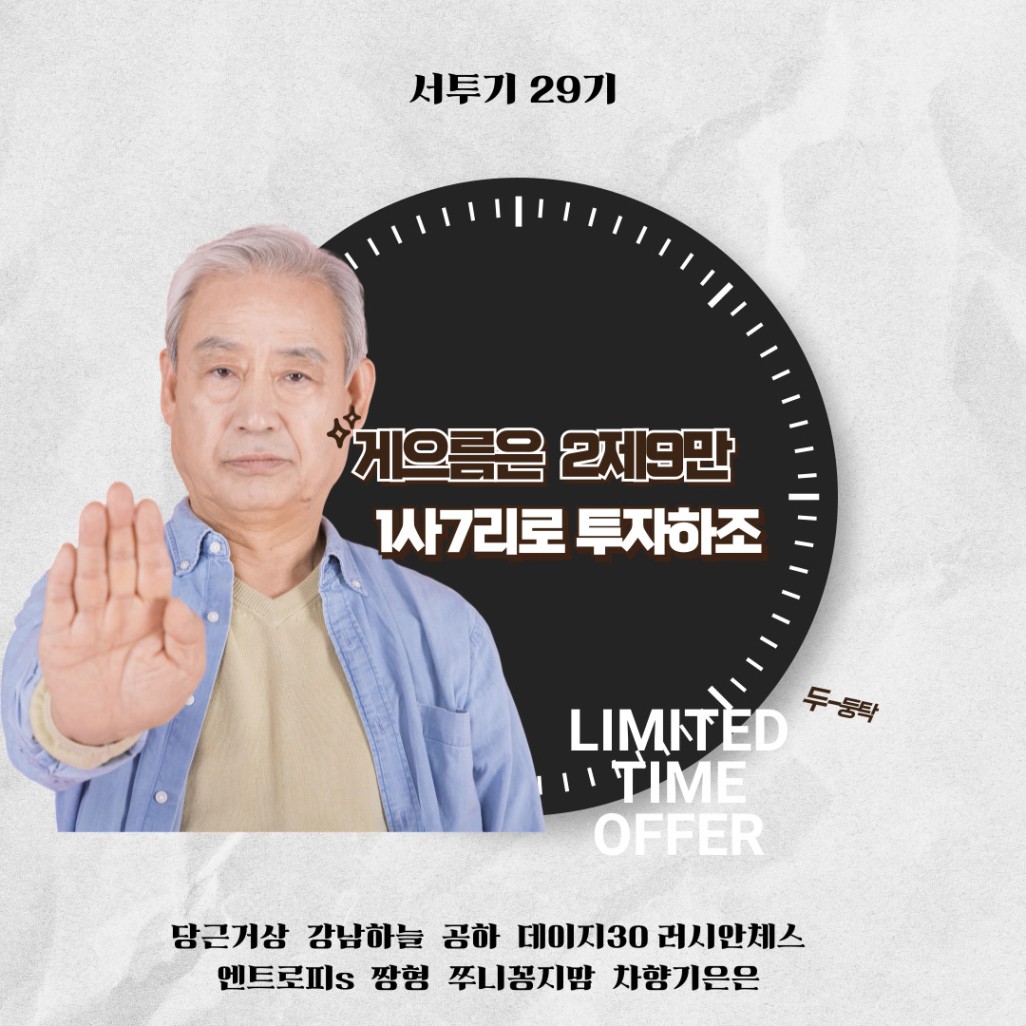 이번에 1호기를 목표로 하고 있는 서투기 29기 게으름은 2제9만 1사7리로 투자하조 조원들도 모두 파이팅입니다!!!