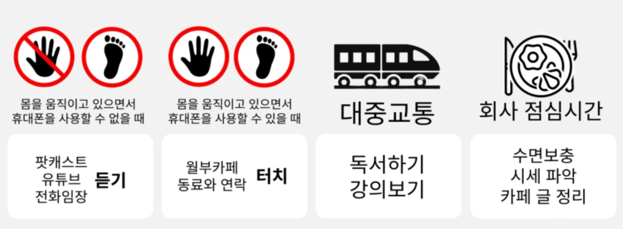 개인적으로 제가 가장 충격받았고, 저에게 도움이 되었던 부분입니다. 권유디 튜터님의 10억 달성기에서 읽었던 내용인데요. “나는 이 시간에는 이런 일을 하는 사람”이라는 행동양식 하나가, 열정보다 더 큰 성과를 낼 수 있음을 직접 해보며 느꼈던 부분이 많습니다.