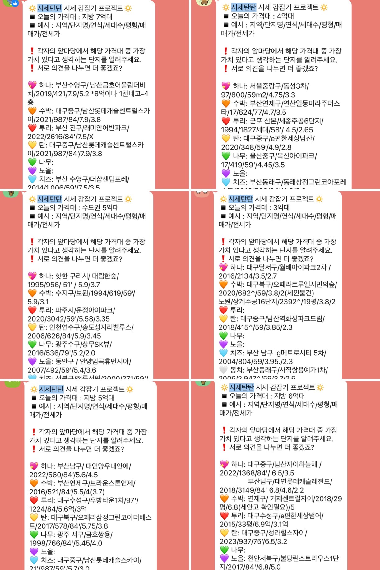 이번에 처음으로 조원들과 함께 시세 루틴을 만들고 싶었습니다. 매일 가격대별 앞마당에서 좋은 단지를 뽑으면서 시세스캐닝과 간단한 비교평가를 할 수 있지 않을까라는 취지였고 조원분들 모두 참여해 주셔서 성장에 도움이 된 루틴이 되었습니다. 그리고 지역별로 나눠서 진행해야 비교평가가 더 잘 될 것 같다고 조언 해주신 포도링 튜터님께 감사합니다.