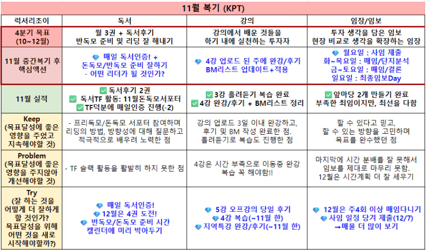 12월 목표 : 독서TF 돈독모 리딩 / 후배 대화 참여 / 나눔글 3개 / QnA 게시판 댓글 20개