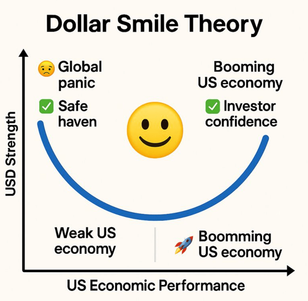 즉 미국 경기가 좋을 때도 달러가 강세이고, 미국 경기가 나쁠 때도 달러가 강세이기 때문에, 비기축국인 우리 입장에서는 달러 자체가 쿠션 역할을 해줄 수 있는데, 이것을 달러 스마일 이론으로 설명한 것입니다.