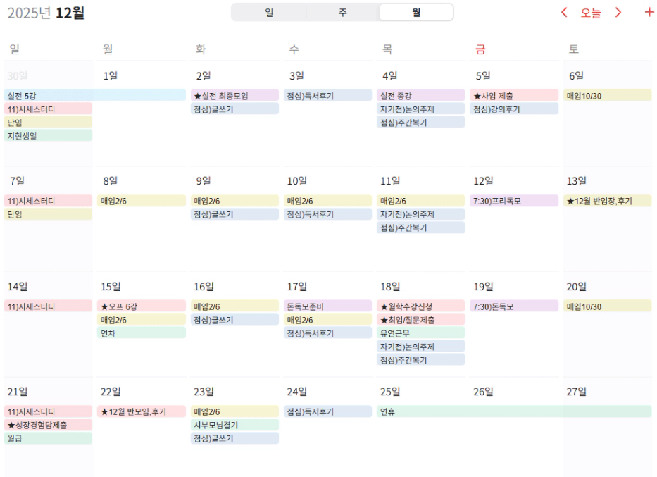 양파링 멘토님께서 추천해주신 ‘더 시스템’ 책을 읽고 이제는 열정을 ‘의지력’ 뿐만 아니라 ‘시스템’으로 유지해야할 단계라는 것을 깨달았습니다. 반독모에서 험블 반장님을 통해서 시스템은 1)우선순위 (꼭 필요한 것부터, 0순위는 멘토님의 방향성) 2)인풋으로 돌아간다 는 점을 배웠고 책에 나온대로 최적화보다는 단순화된 시스템을 통해서 시스템을 수행하는 것 자체로 성공할 수 있도록 12월을 설계해보았습니다.