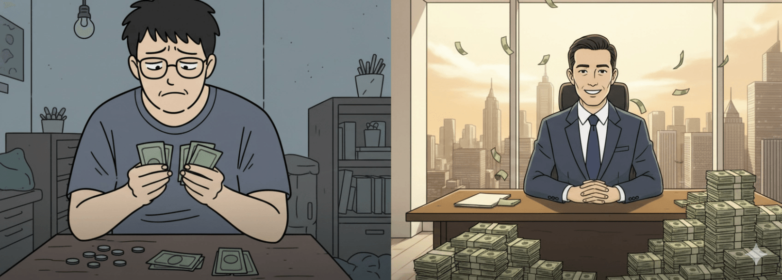 왜 격차가 벌어지게 되는 걸까? 바로 젊은 시절에 '돈 공부'의 차이가 결정적인 원인이 되기 때문이다. 여기서 말하는 '돈 공부'란 단순히 적금을 붓고 주식 차트를 보고, 단타를 하는 기술이 아니다. '가치를 창출하는 능력'을 훈련했느냐, 아니면 단순히 시간을 팔아 돈을 벌었느냐의 차이다.