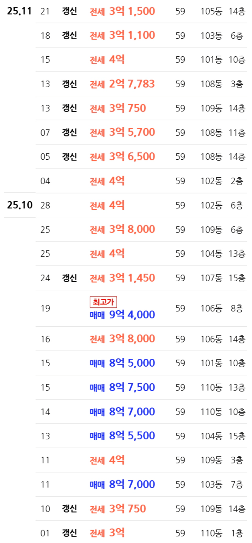 최근 실거래가를 보면 10월 20일 이전까지 미친듯이 계약건이 찍혀있다가 그 뒤로는 정말 매매거래가 뚝 끊긴 것처럼 보인다. 하지만 실제로 주변 지인들의 이야기를 들어보면 토지거래 허가가 영업일 기준 15일가량 걸리고, 토지거래허가를 관할하는 곳에서는 처리해야 할 서류가 수천~수만 건이 쌓여있어 처리하는데 꽤 오랜 기간이 소요된다. 10월 22일 경 매수를 한 친구는 지난 주에 정식으로 계약서를 작성했는데, 아직도(현 11월 28일) 그 계약서 작성 건의 거래 신고가 올라가지 않은 상태라 해당 단지에서는 10.20일 이후 매매 거래가 0건으로 찍혀있다. 다른 지역의 단지들도 마찬가지인 상황이기 때문에, 현재 거래량이 뚝 떨어졌다고 해서 토허제의 효과가 그만큼 강력했다고 보기는 어렵다. 물론 이전에 불붙은 거래량만큼 거래건수가 높진 않겠지만, 단순히 토허제가 발효되었다고 해서 거래량이 하락장 때만큼 뚝 끊기는 건 아니고 지금은 일종의 착시기간이라는 의미다. 이제 슬슬 그 이후에 거래되는 계약 건들이 등장하기 시작할 때가 되었다.