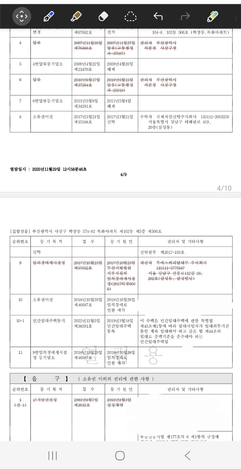 안녕하세요. nlulllll님 해당 물건은 신탁사가 등기를 했다 소유권 이전(지워진 부분) 이 되었으므로 등기가 말소가 되었을 것으로 보입니다. 걱정되시면 간추린 버전으로 최종 소유권이 누구에게 있는지 확인하시면 될것 같아요. 답변이 도움 되셨길 바랍니다.