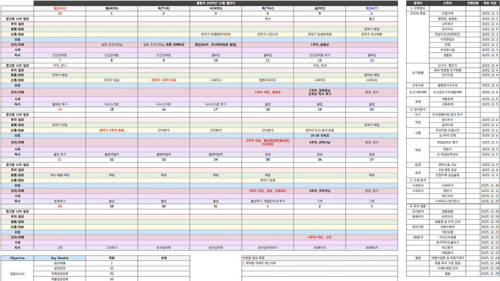 12월에 일부러 과하게 목표를 세웠다. 내가 할 수 있을까? 생각이 들지만 그럼에도 불구하고 해내는 경험을 갖고 가고 싶었다, 그리고 이만큼 목표를 세워두어야 내가 80%라도 달성하려고 할 것 같다. 남은 휴가와 공휴일 활용해서 최대한 목표한 걸 해내자! 다만, 내가 너무 힘들어서 KO될 것 같다면 목표 조정하고 항상 나를 챙겨가면서 하자! 스스로도 유리공임을 잊지 말자❤️
