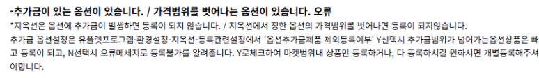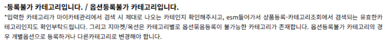 안녕하세요 제인 대표님~ 옥션에서 발생하는 오류의 경우 미출력으로 설정해주시면 되는 오류가 맞아요~ 지마켓의 경우 제가 섬유탈취제 카테고리로 검색해보니 옵션이 등록된 제품이 있어서 카테고리 자체에는 문제가 없는것 같아요 해당 상품의 마이카테 값을 한번 점검해보시고, 웹유플랫 -> 마이카테관리에서 해당 마이카테를 검색했을 때 오류가 없는지도 함께 봐주시면 좋을것 같습니다.