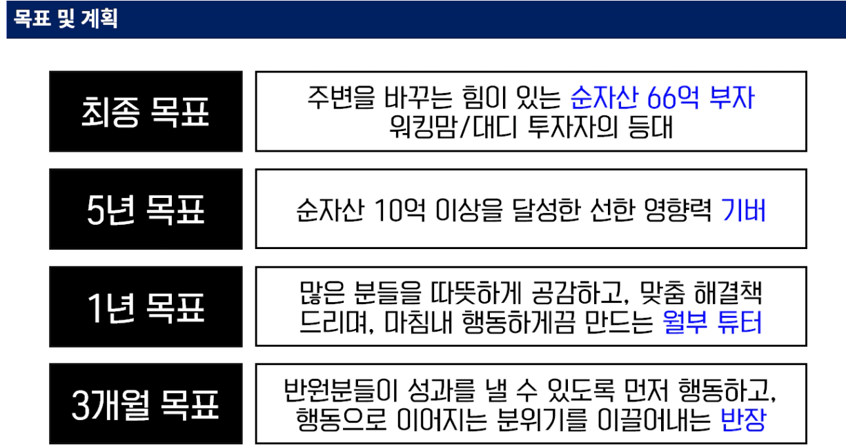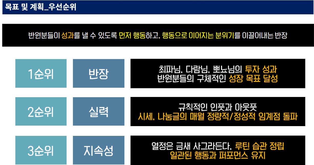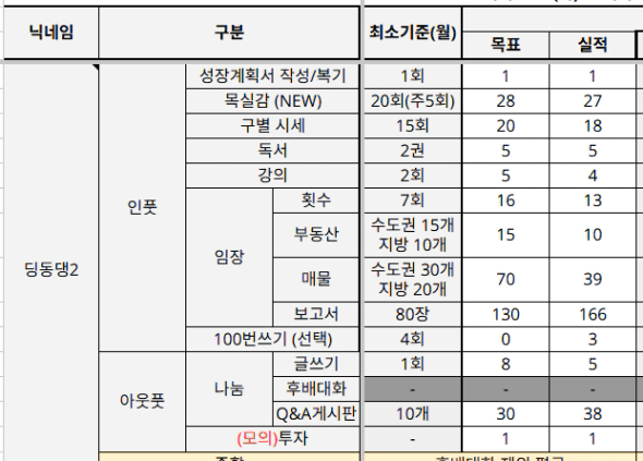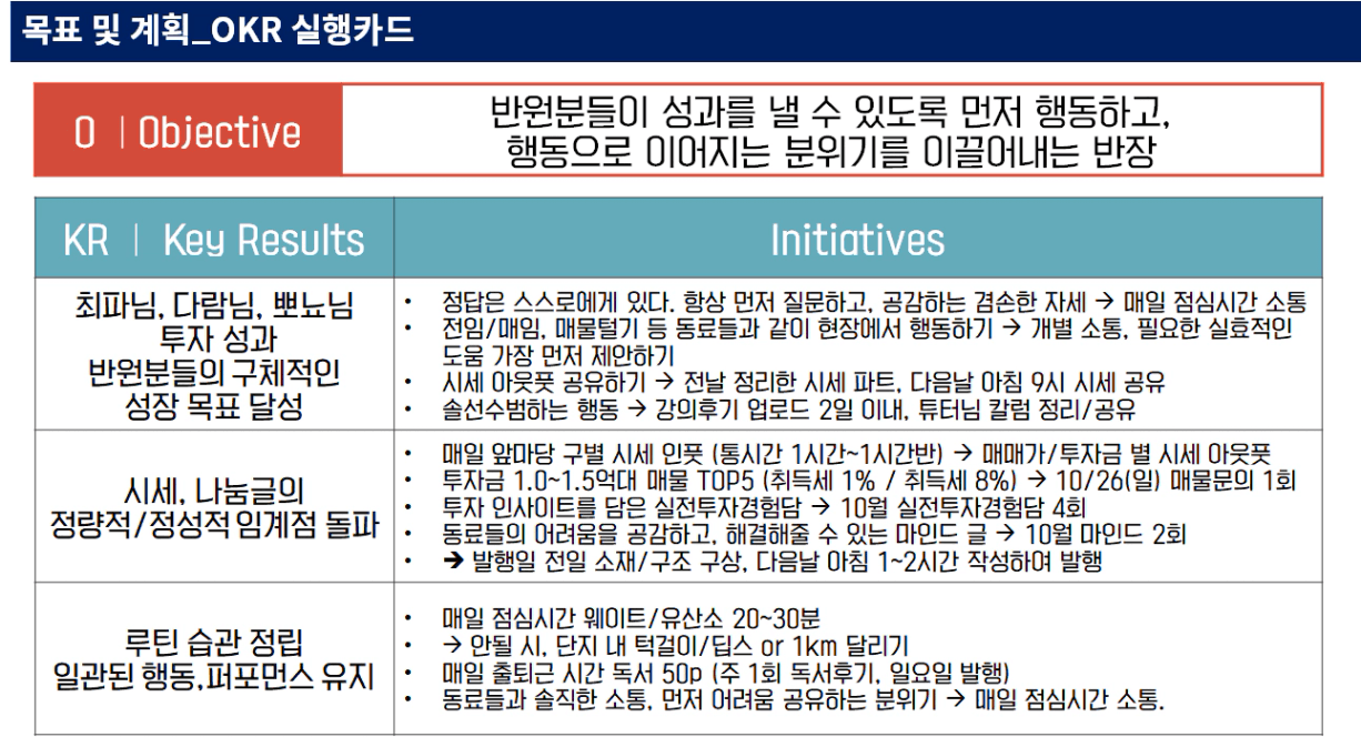 P : 그럼에도 양적으로 부족한 상황. 단지분석, 전임으로 부족한 부분은 채우고, 반원분들과 적극적인 소통을 통해 궁금증을 해결해야함. 나머지는 투자 전사분들의 매물까지 상황 파악할 수 있도록 인풋 넣기.