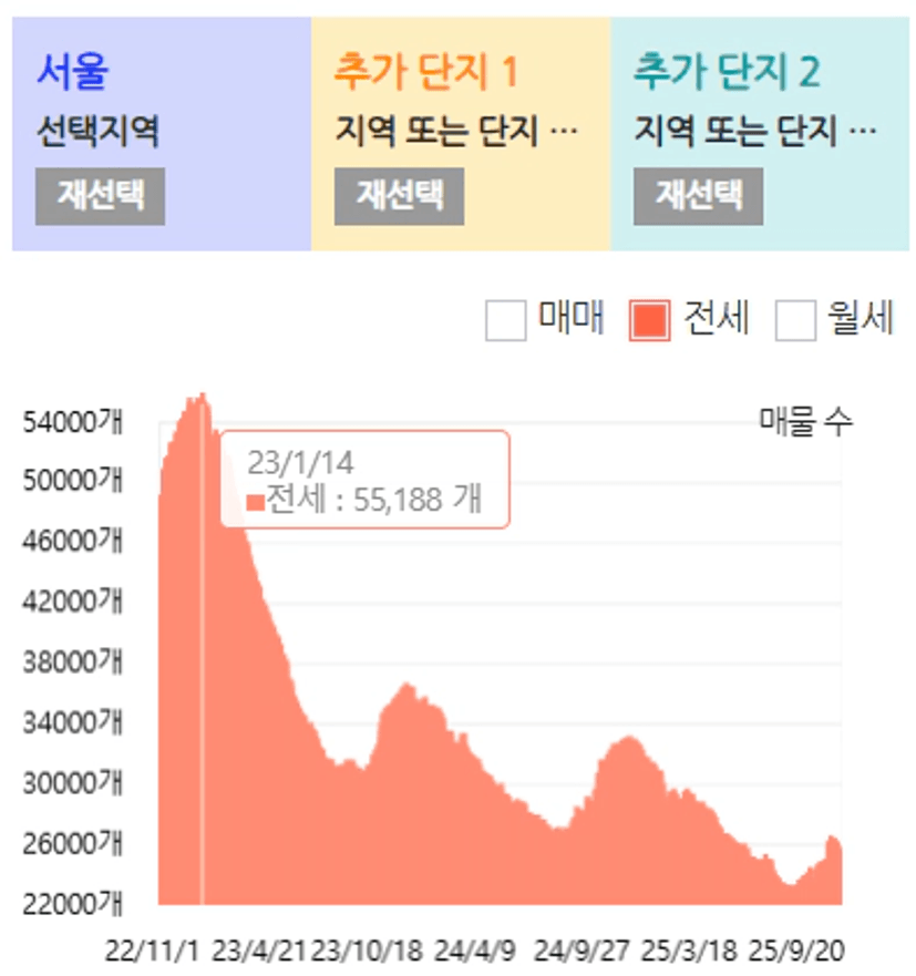 23년 초 전세 매물이 많았던 시기에는 5만 5천 개가 넘었던 전세 매물이
