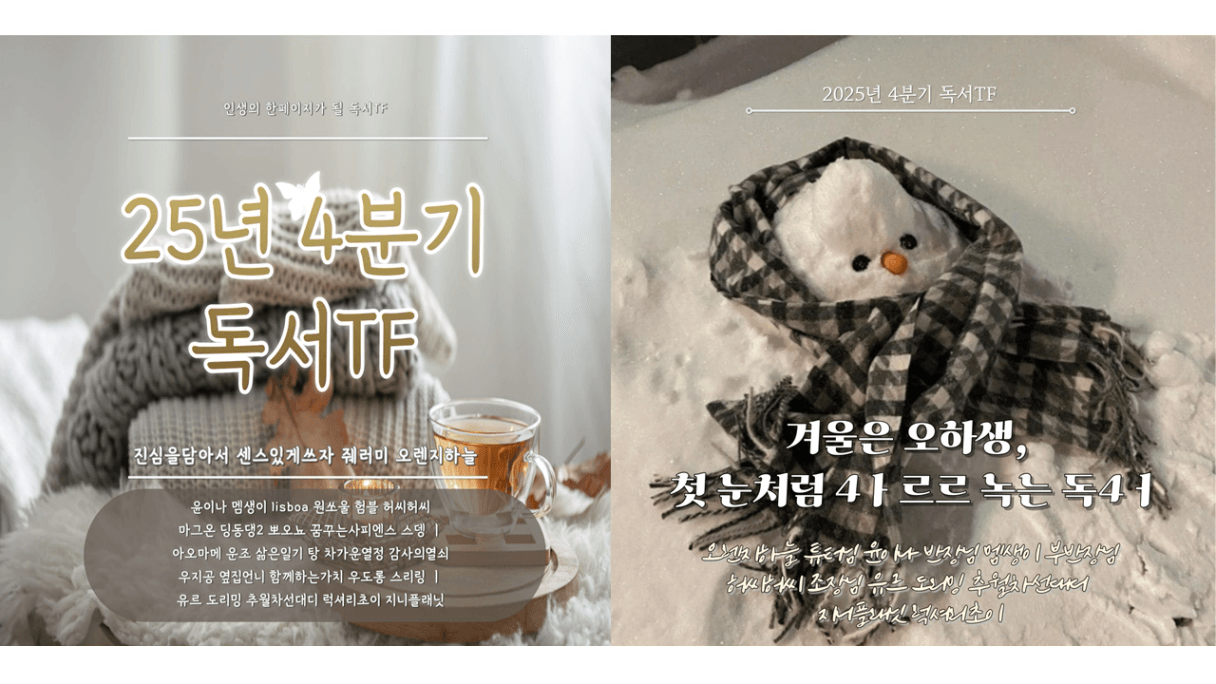 너무 좋은 분들과 함께 하게 된 4Q 독서TF라서 더욱 풍성하고 의미 있는 시간을 채울 수 있을 것으로 기대됩니다!