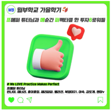 캬 호잉님 넘넘 멋지게 달리고 계시네요♡♡♡ 아마 쉬지않고 열심히 달려오시느라 힘드신점이 조금 있으셨지 않을까 걱정도 되구 잘 극복하신것같아 다행이다 생각두 들구 합니다! 맞쥬 ?! 호잉님♡♡♡ 넘 열심히 달리고 계셔서 정말 성장통을 겪은게 아닐까 생각이 드네요~! 정말 멋진 호잉님♡ 12월도 화이팅 화이팅이에요!!♡ 가을학기 마지막! 아좌좟 화이팅입니다♡