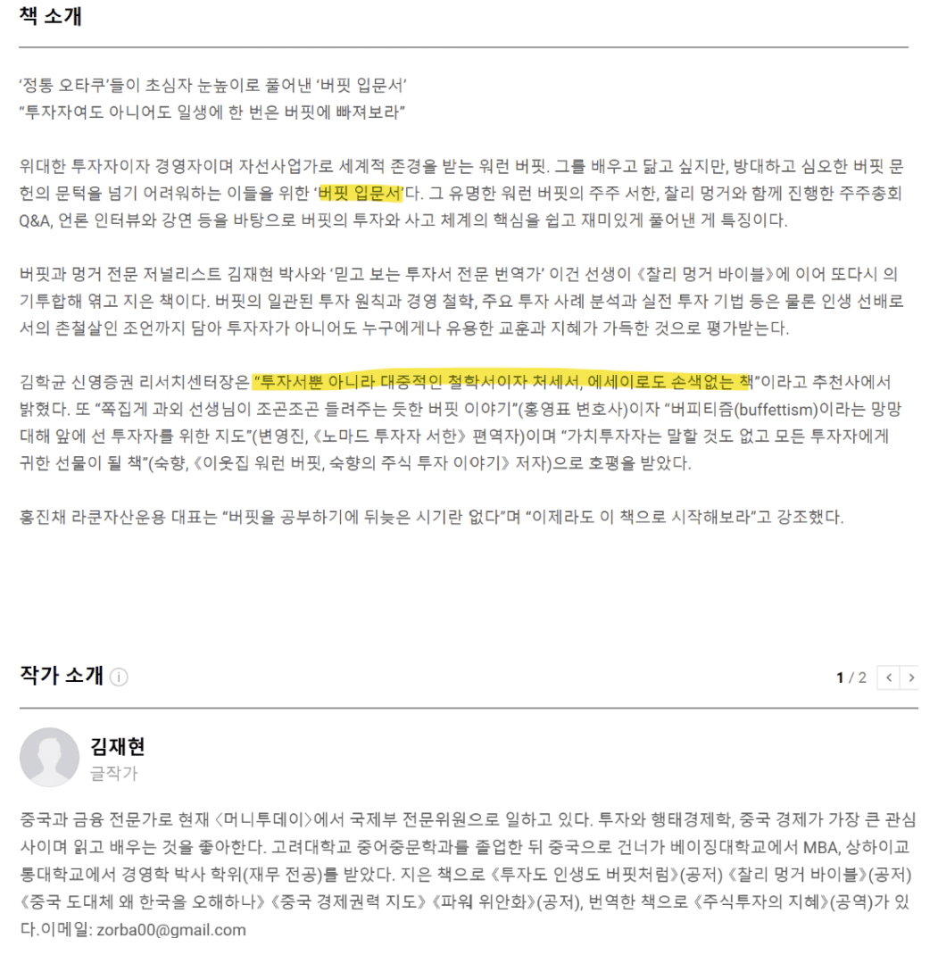 | 한줄평 | 버핏의 이야기 속에 녹아있는 철저한 투자기준을 온전히 배울 수 있는 책 |