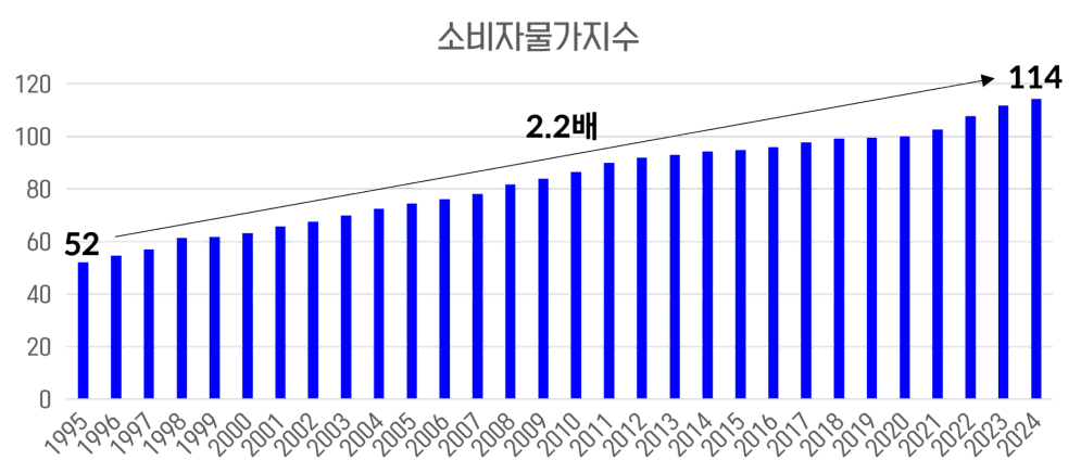 소비자물가지수(CPI)를 보면 30년 동안 2.2배 올랐습니다.