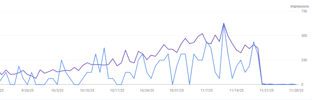 < 구글 써치 콘솔에서 11월 말부터 갑자기 impression과 click 집계가 수직 하락했습니다. 해결 방안을 알고싶습니다. >