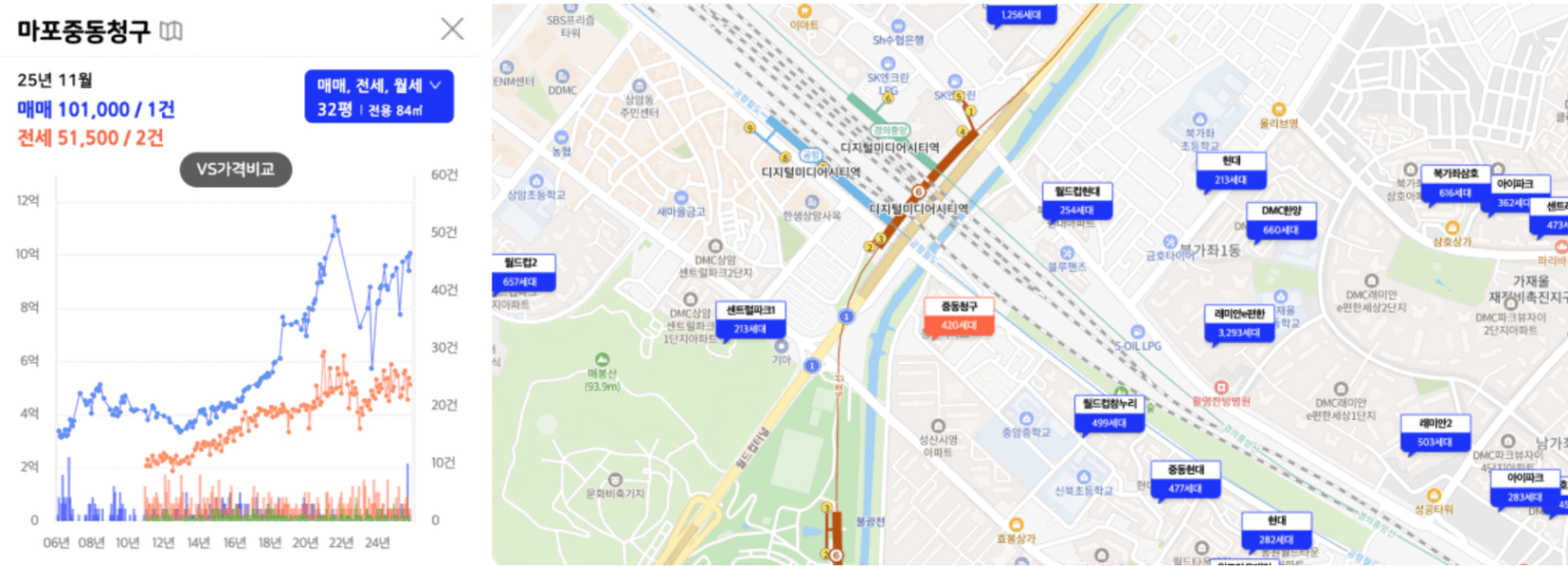 그 중에 우하단에 위치한 아파트가 DMC중동청구 (DMC마포청구) 입니다. 84타입 단일평형이고요.
