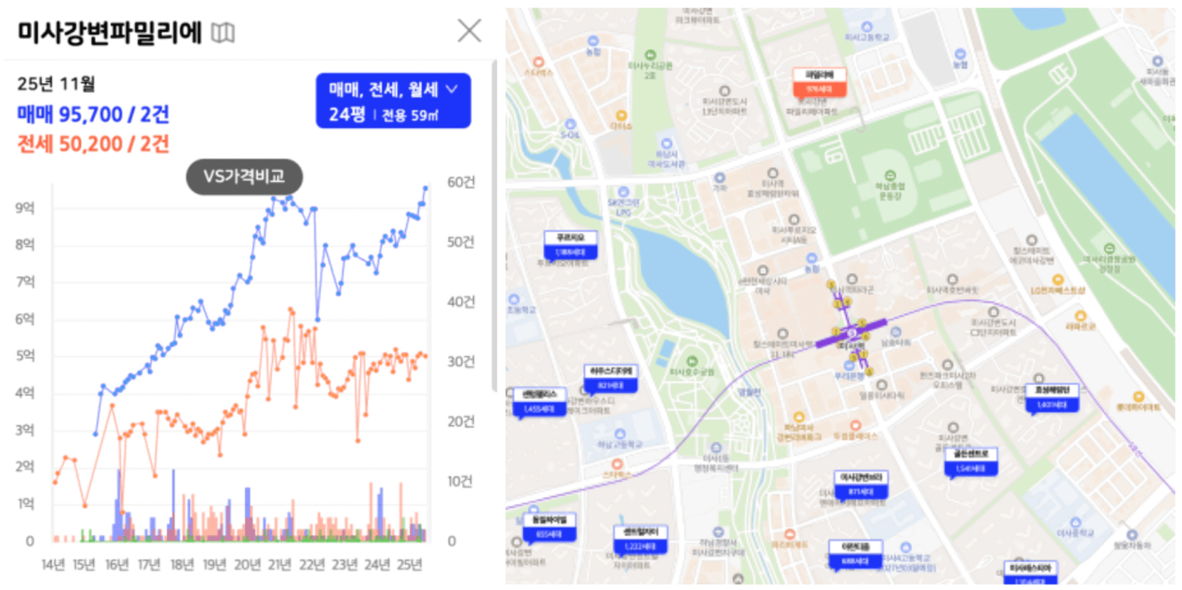 나름 연식이 준수한 단지들이지만 아무래도 생활권의 선호도와 입지 때문에 가격은 5억대에 그치네요.