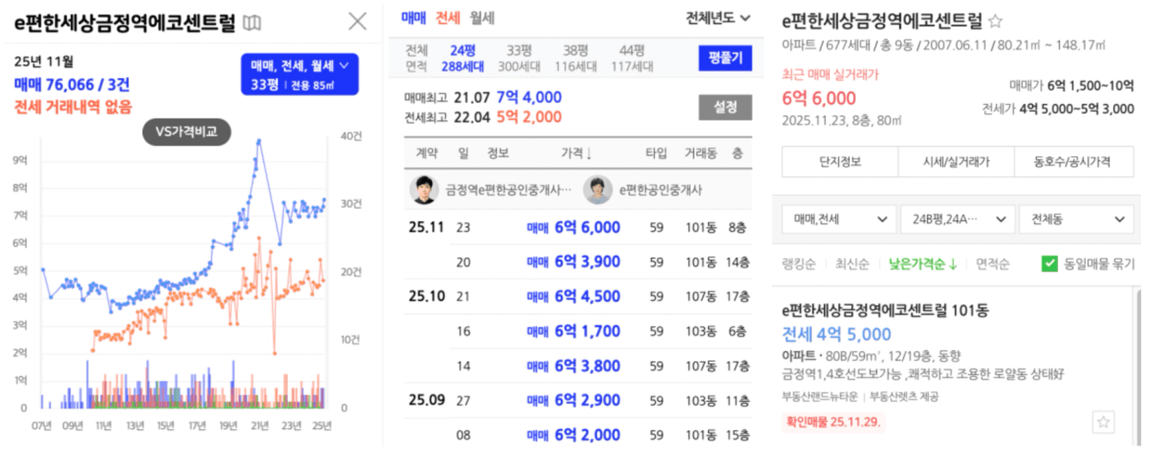 그 바로 옆에 위치하고 있는 준구축 (2007년식) e편한세상금정역에코센트럴이 6.6억에 거래되었습니다.