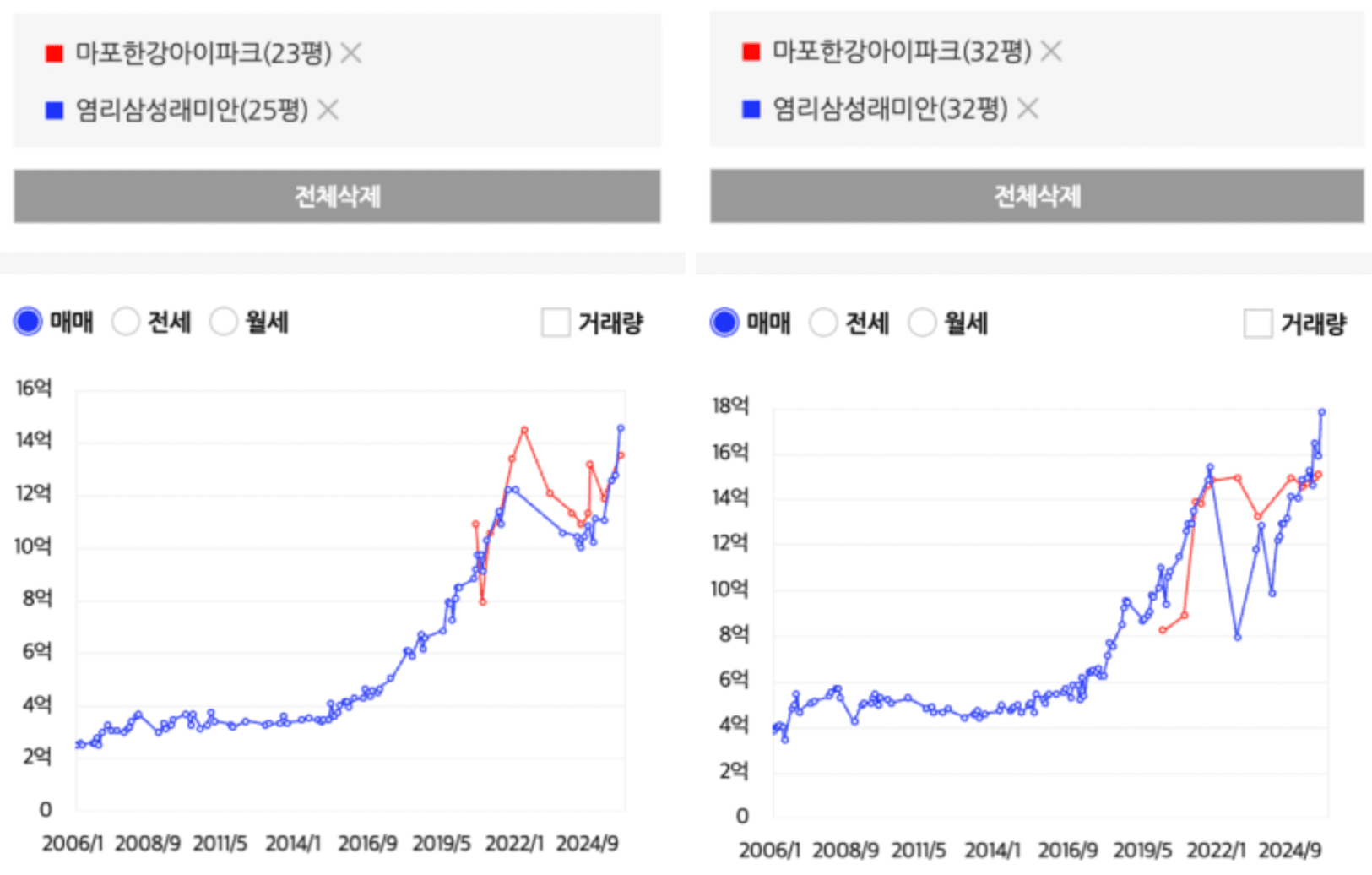 신축, 한강, 나홀로 아파트인 마포한강아이파크보다 구축, 쿼더러플 역세권인 염리삼성래미안이