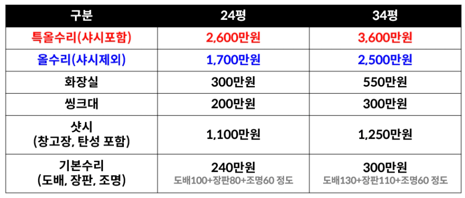 특올수리 또는 최근 올수리 → 대부분 수리된 상태이므로 ‘추가 수리가 필요한 부분'만 체크