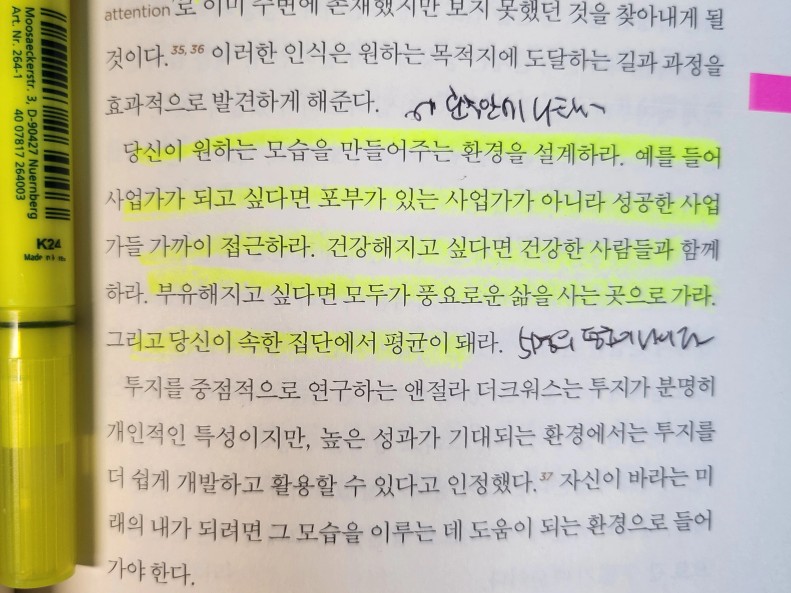 : 1.현실에 맞는 목표를 명확하게 세워라. 장기적인 미래의 나와 연결하고, 우선순위 세가지를 정해 현실에 맞는 목표를 명확하게 세우고, 이를 토대로 12개월 목표를 세워라. 인생은 정원과 비슷하다. 정원을 관리 하지 않으면 여기저기서 잡초가 무성하게 자란다. 너무 많은 목표와 우선순위가 있는 인생도 마찬가지다. 2.덜 중요한 목표들을 제거하라. 완벽함은 더는 추가할게 없을때가 아니라 더는 뺄게 없을때 이루어진다.(생텍쥐페리) 우선순위 목표에 집중하기 위해 덜 중요한것을 제거해야한다(주우이 멘토님: 하고 싶은 일을 더 오랫동안 하기 위해 지금은 해야만 하는 일을 먼저 해야 한다.).