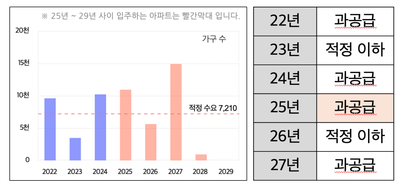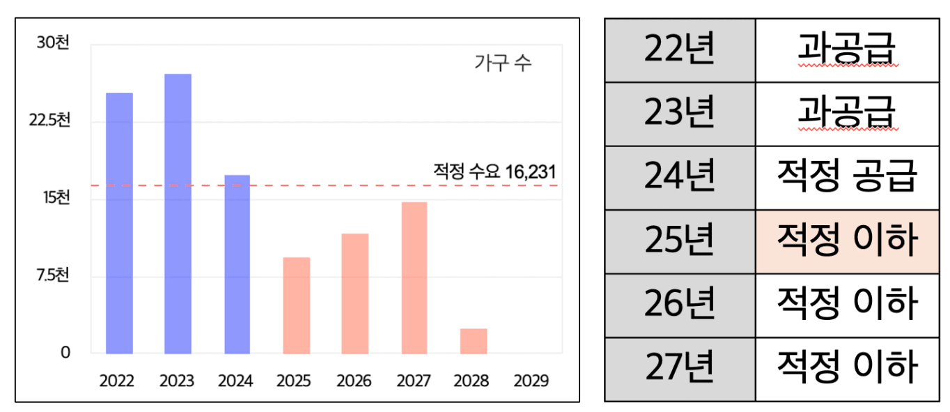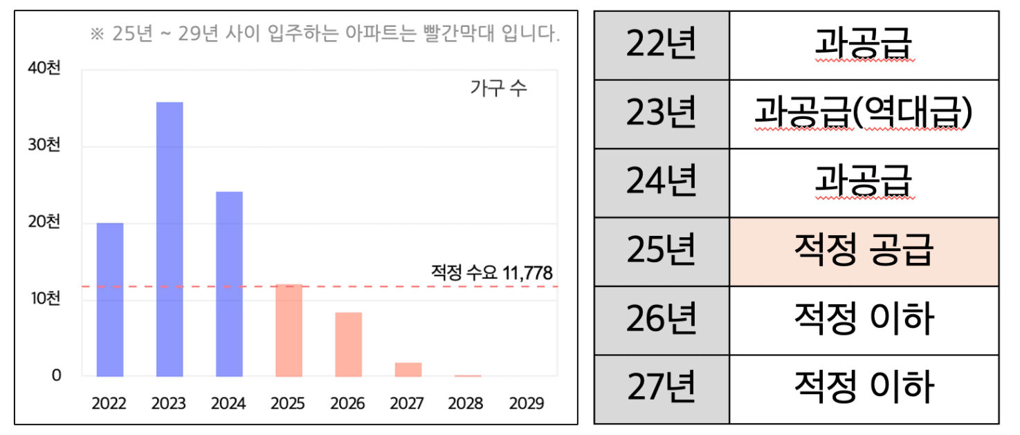 부산/대구와 다르게 작년에 이어 올해까지 과공급이 이어지고 있습니다. 내년에 적정 이하로 떨어지지만 27년에 적정 수요대비 2배에 달하는 공급이 예정되어 있습니다. 공급 상황은 상승 흐름을 만드는데 긍정적이지 않습니다.