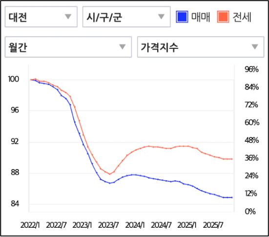작년부터 올해까지 과공급이 이어졌고 특히 올해는 둔산자이아이파크, 둔산더샵엘리프와 같이 중심 위치에 신축이 들어오며 매매/전세 하락이 일어났습니다. 내년부터 반등을 꾀할 수 있지만 27년 입주에 주춤할 수 있습니다. 물론 공급으로 모든것을 예측하기 어렵지만 27년 물량 역시 사람들이 선호하는 중심지에 들어온다는 점에서 올해와 같은 매매/전세 하락이 일어날 수도 있습니다.