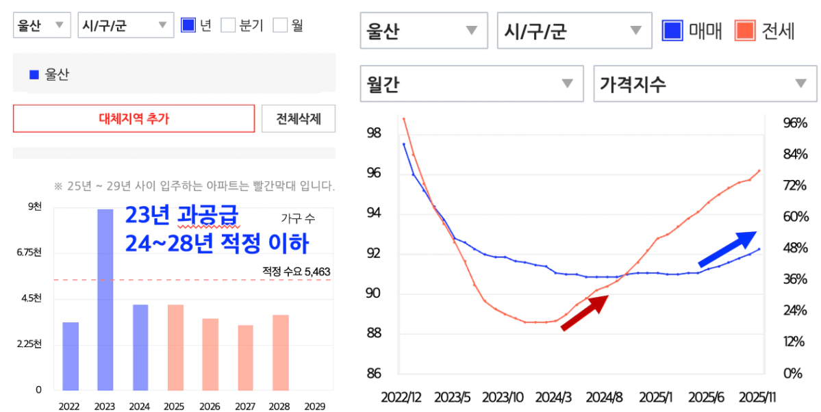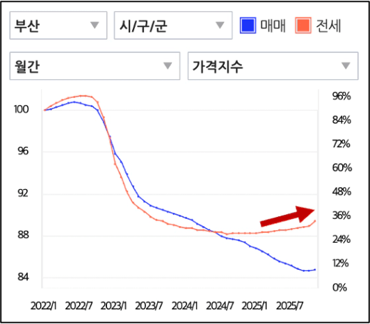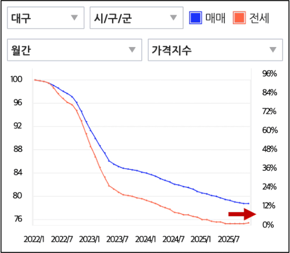 올해(25년) 가을부터 전세가 바닥을 다지고 있는 모습입니다. 대구는 내년부터 적정 이하의 공급이 예정되어 있기에 올해 부산의 상황이 내년에 대구에서 펼쳐질 수 있습니다. 사이클상 대구가 부산 뒤에 있는 것입니다.