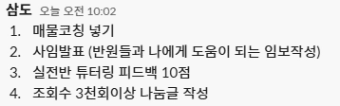 임보는 항상 미완성 제출. 튜터링데이에 고개를 들 수 없을 정도의 죄송함과 부끄러움이 많았던 거 같습니다. 그래서, 이번 12월은 다른 시도를 하고 있습니다. 생활권 정리에 해당 지역의 다른 구와 비교를 넣어보고 임보는 통으로 복붙 하지 않고 1장씩 작성해 보고 있습니다. 이런 변화를 통해 이번 달 사임 발표는 삼도 몫입니다!