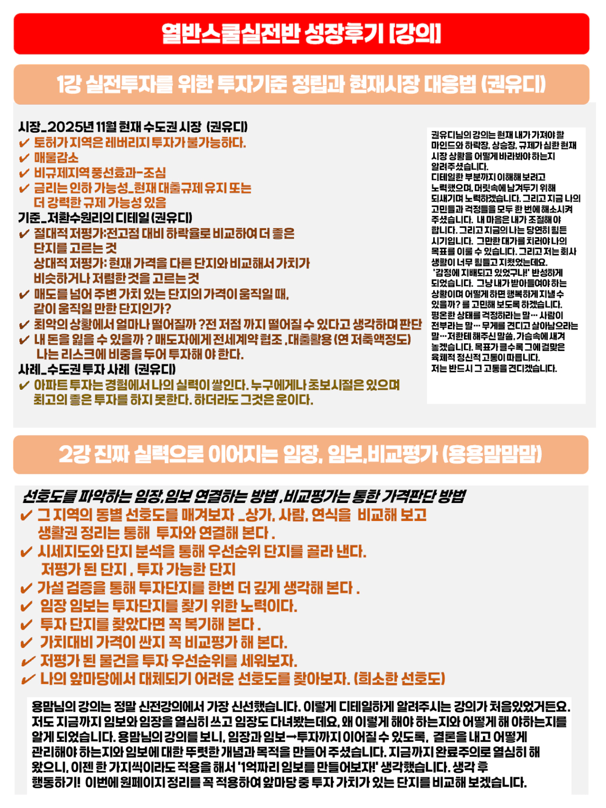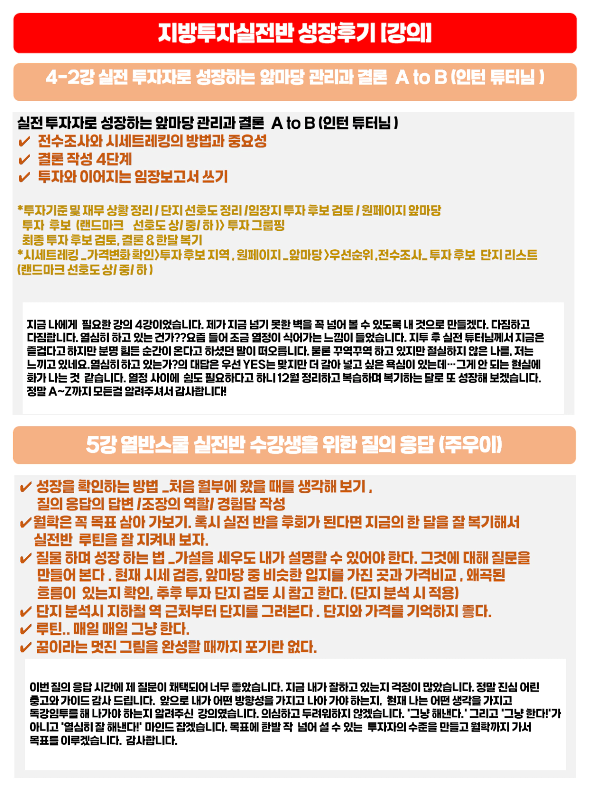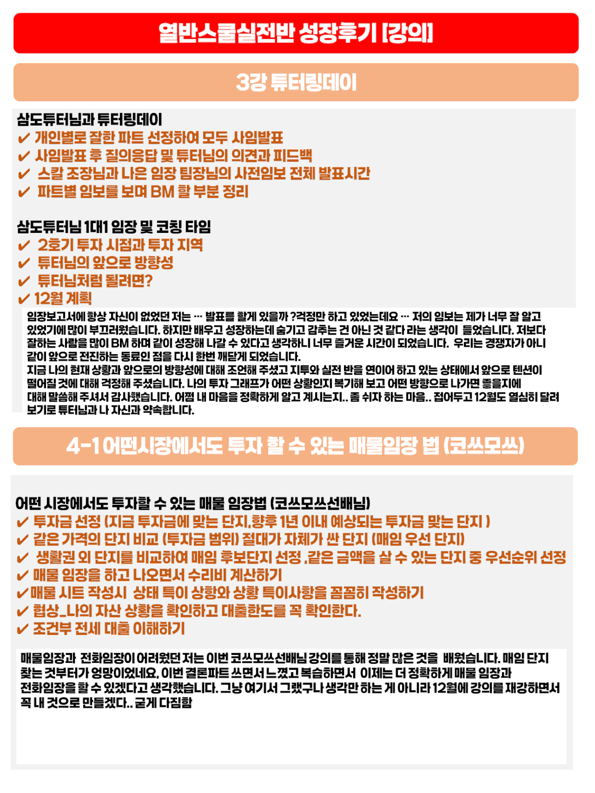 와....... 진짜 꽃길님은!! 깔끔 정석 대단하십니다 :) 어쩜 이렇게 이쁘게 정리하십니까~~~~ 부럽자나요!! 이쁘게 정리해주셔서 더더욱 내용 보면서 복기할 수 있었던 것 같아요! 각자가 성장할 수 있었던 것 같아서 넘 좋네요! 꽃길님 한달간 너무 감사했습니다 💕👍 고생많으셨어요! 😁