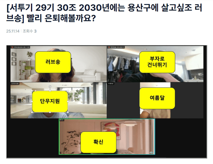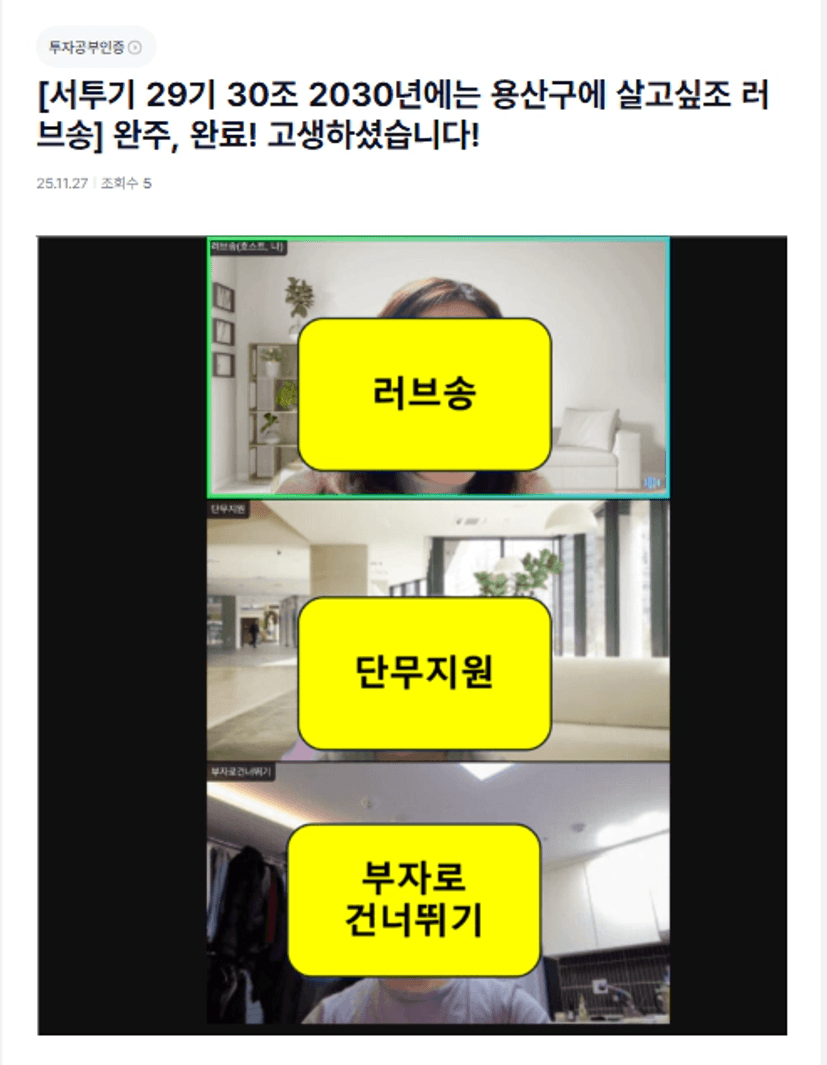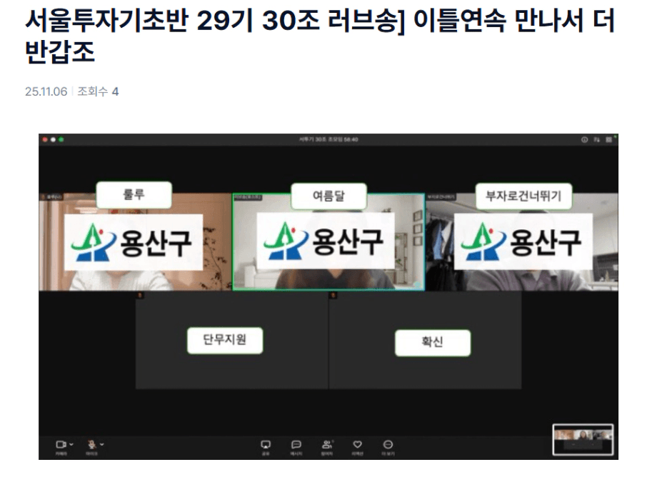 서투기 29기 30조 20 30년에는 용산구에 살조!! 모든 조원분들 원하시는 내집마련, 투자 꼭 성공 하시길 응원 하겠습니다 지난 한달 동안 정말 정말 고생 많으셨습니다 많은 도움 주셔서 감사합니다 😍