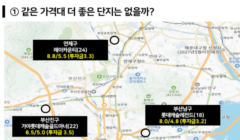 예시는 8억대의 부산진구의 가야롯데캐슬골드아너(22년) 아파트였고, 비교대상은 연제구 레이카운티(24년), 남구 롯데캐슬레전드(18년)으로 비교해주셨습니다.