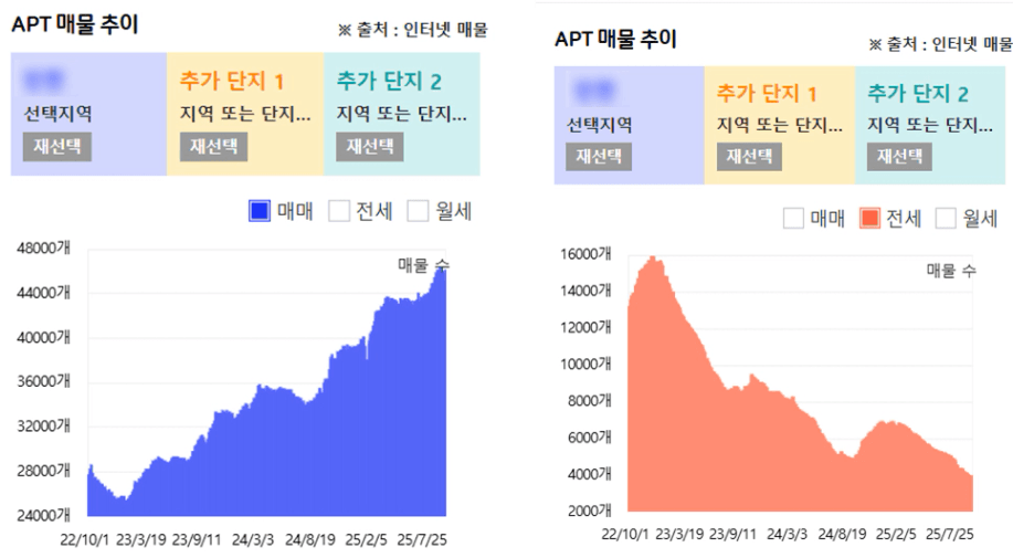 매물 수를 보니 매매는 증가하고 전세는 감소하는 모습이었다.